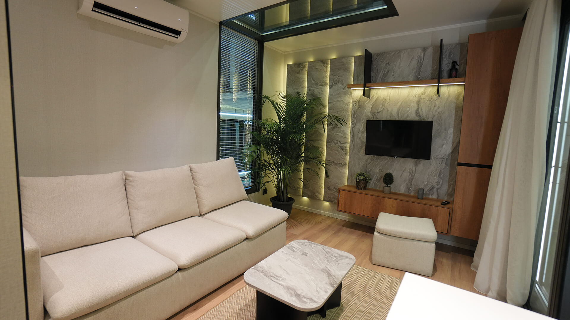 Wählen Sie für dieses Modell die Ausstattungsvariante Comfort und genießen Sie das Gefühl eines modernen Hotelzimmers. Die Gestaltung erinnert bewusst an hochwertigen Hotelkomfort – so, wie Sie ihn bereits auf den oberen Bildern sehen können. Vollständig möbliert, mit durchdachten Einbaumöbeln und einer stimmigen, zeitlosen Ausstattung, bietet diese Variante eine perfekte Kombination aus Funktionalität, Design und entspanntem Wohngefühl für Gäste mit gehobenem Anspruch.
