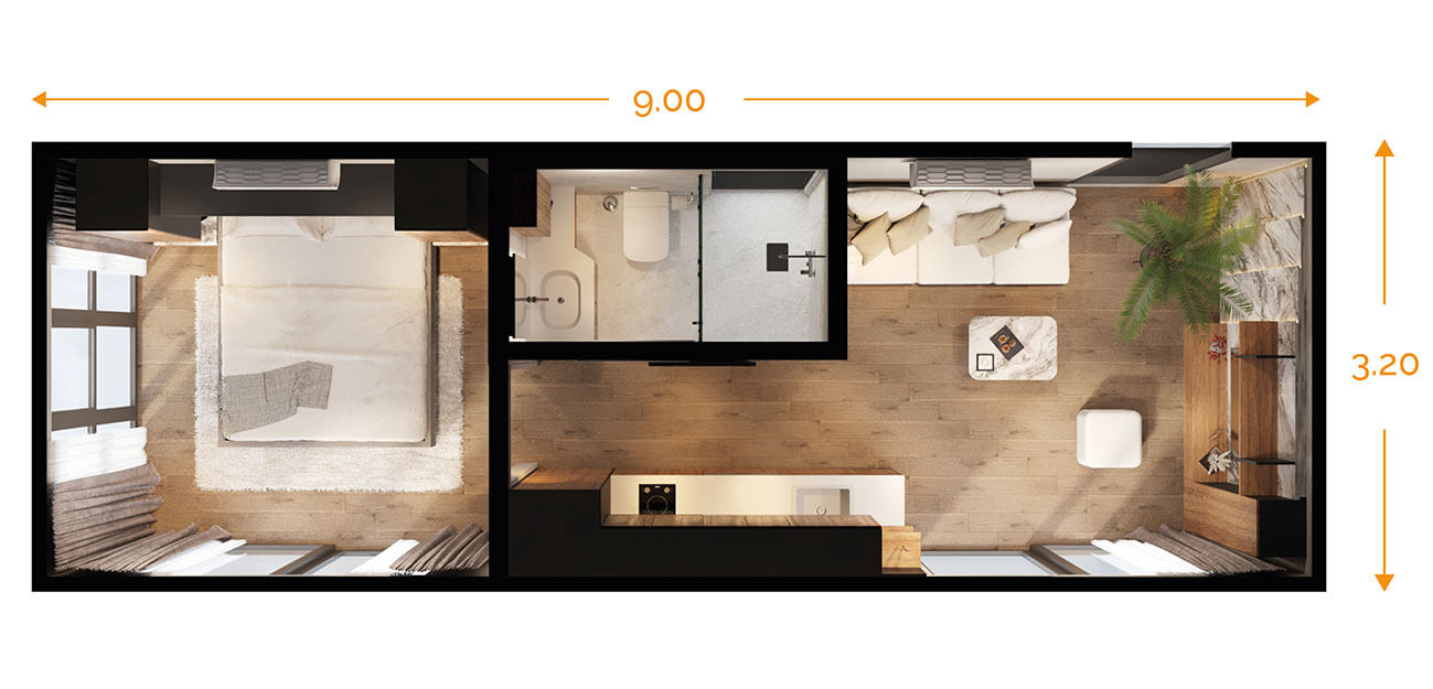 Wählen Sie für dieses Modell die Ausstattungsvariante Comfort und genießen Sie das Gefühl eines modernen Hotelzimmers. Die Gestaltung erinnert bewusst an hochwertigen Hotelkomfort – so, wie Sie ihn bereits auf den oberen Bildern sehen können. Vollständig möbliert, mit durchdachten Einbaumöbeln und einer stimmigen, zeitlosen Ausstattung, bietet diese Variante eine perfekte Kombination aus Funktionalität, Design und entspanntem Wohngefühl für Gäste mit gehobenem Anspruch.
